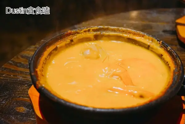 黃澄的南瓜濃湯 在滾燙的砂鍋邊緣吱吱作響