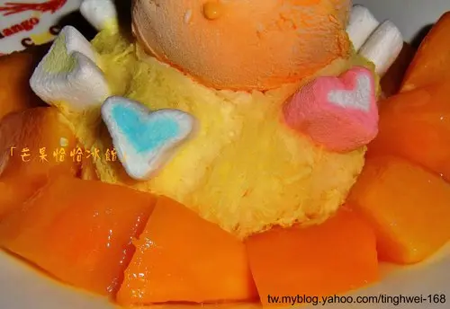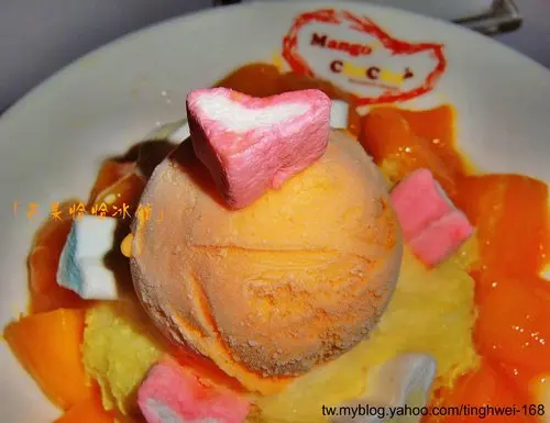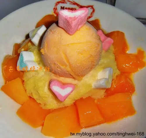 加上新鮮芒果冰,還有最上面一球法式手工芒果冰淇淋,