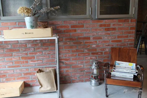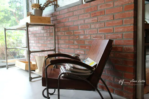 門口左邊用紅磚砌成,搭以鋁窗還有棕色木椅,雖是冷靜工業風,卻又透露著小小的溫暖。