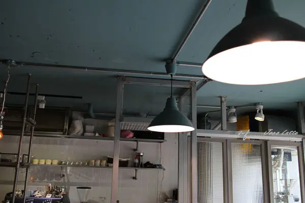 裸露於外的管線,搭以藍色天花板及燈罩,引出清新的味道。