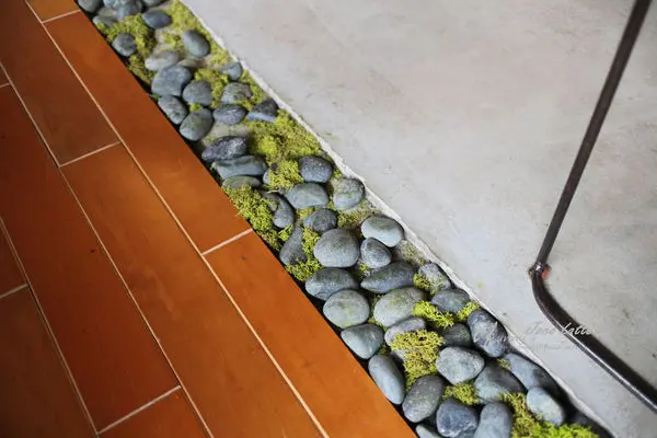 室內木頭地板及水泥地板中,放上個頭不小的石子及小草,讓綠意軟化了冷洌感。
