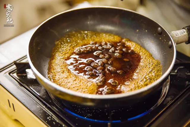 加入咖啡和糖,開始烘烤出咖啡豆本身的油脂與香氣。