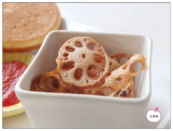 附上一小份炸蓮藕片,可沾點旁邊的莎莎醬一起食用