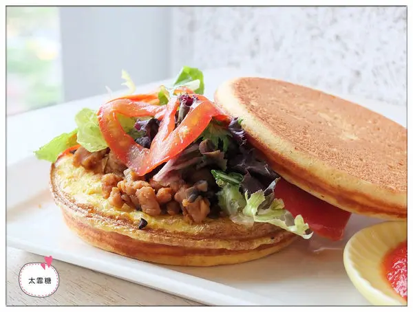 新鮮生菜加上以素肉自製而成的哨子醬當內餡,搭配烘蛋與豆乳鬆餅