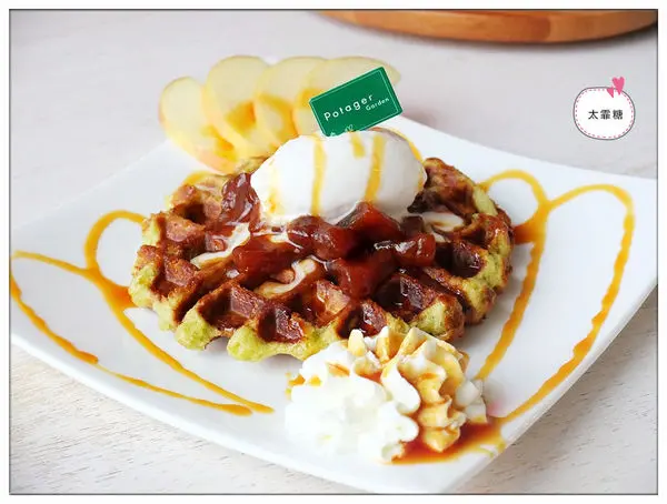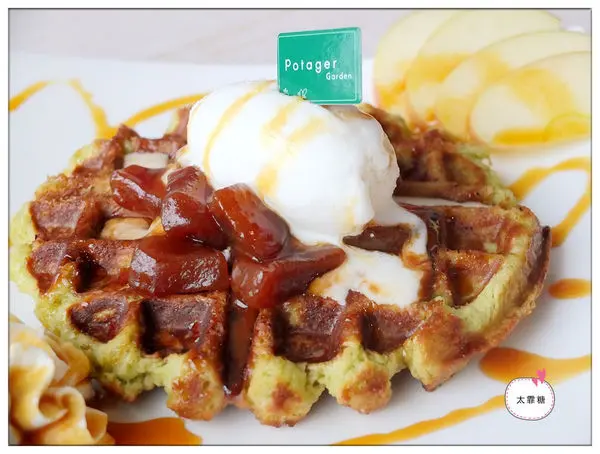 鬆餅上面有少許的蘋果果肉,搭配一球香草冰淇淋,淋上適量的焦糖漿