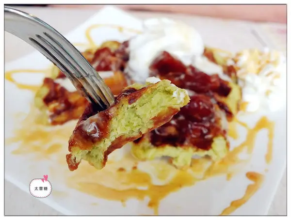 乍見外表呈現淡綠色的鬆餅,我一度以為是抹茶口味,害我驚喜了一下