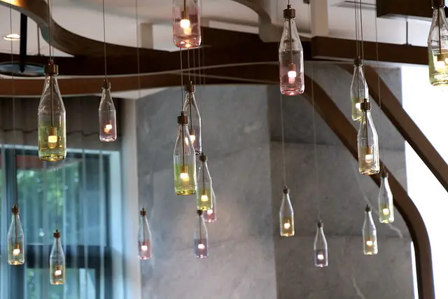 餐廳內以溫暖的黃光搭配特殊的玻璃瓶燈飾營造浪漫氣氛