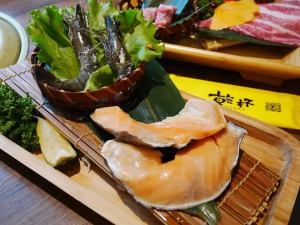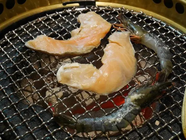 除了肉類,海鮮類當然也有,鮭魚下巴跟草蝦,一次通通給你兩人份