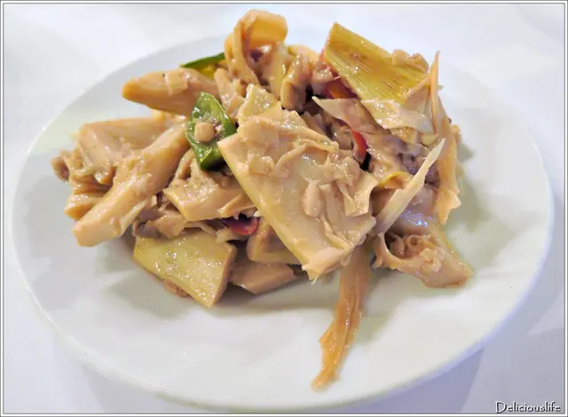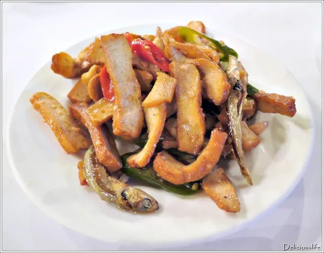 桌上兩盤小菜為招待,小魚豆干和筍絲