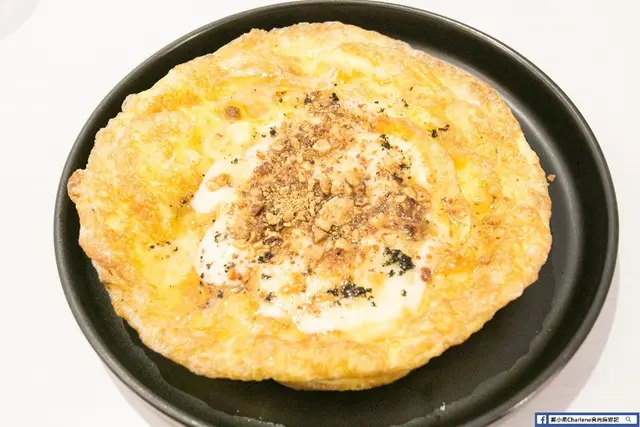 裝著外皮煎得微焦且黃澄澄的烘蛋,再淋上蜂蜜及堅果