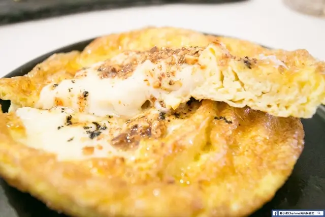烘蛋外層呈現微褐,膨鬆膨鬆,內層滑嫩鬆軟,