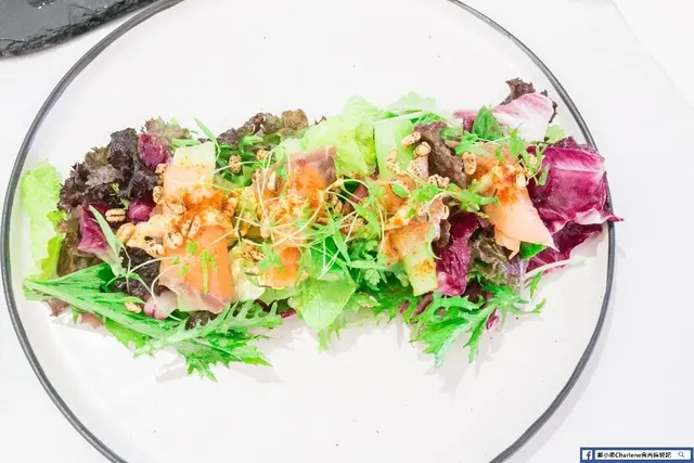 粉橘色的煙燻鮭魚,因表面稍微烤過後,顯得柔軟細緻,香潤有味,