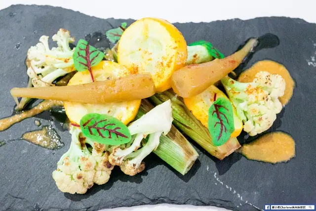 以爐火烤熟蔬菜(花菜、玉米筍、醃製黃蘿蔔等)至清脆柔軟,