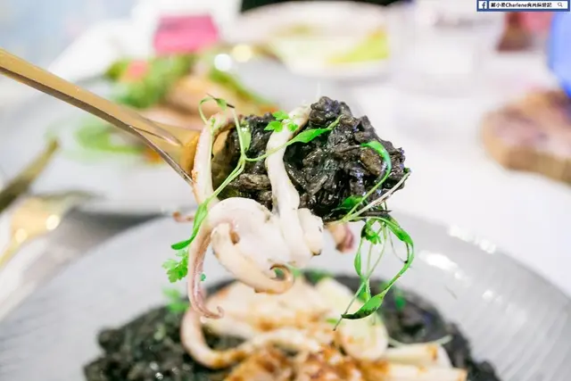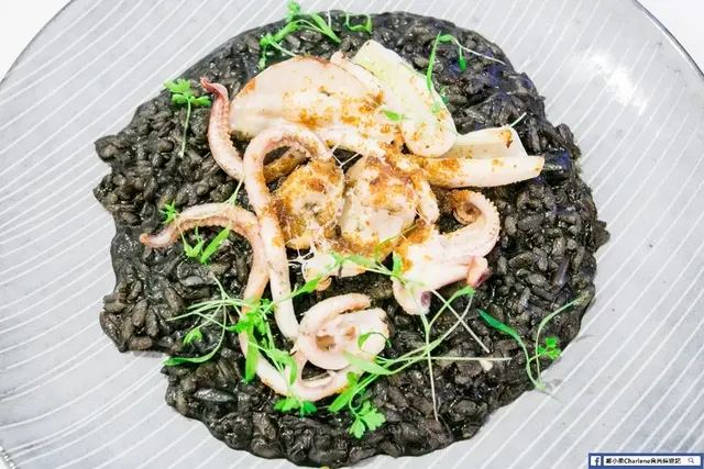 黑黝黝的墨魚汁燉飯,上置透抽及綠菜,