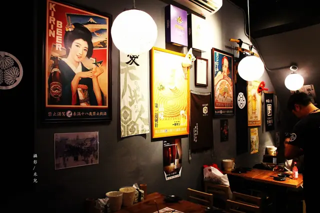 牆上有著戰國時期的武器與一些日本歌妓海報,很濃烈的氣氛,大約10分鐘店內馬上就客滿,