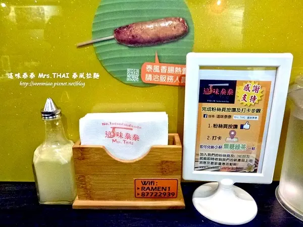 目前還有臉書粉絲頁按讚打卡送無糖綠茶的活動,另外也有免費提供白開水,wifi密碼直接寫在面紙木盒上,不用再起身詢問,十分方便!
