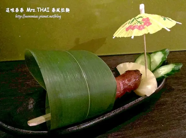 獨創泰風香腸/60元 雖然只是小菜一碟,再平常不過的國民小吃,經過精心打扮sedo後,香腸乘著一葉扁舟划到餐桌上,賞心悅目吃來滋味更加不同! 有別於台灣香腸附的是蒜片,這裡附的是小黃瓜片,加了泰式香料做成的香腸帶點微辣,搭配小黃瓜,又是另一番滋味!