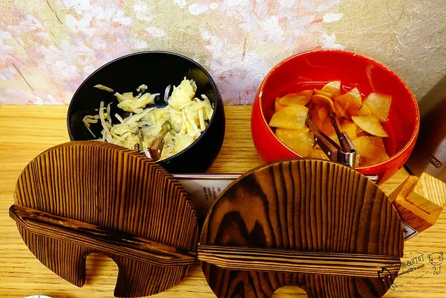 左邊是薑片右邊醃蘿蔔,對於油炸的丼飯或許會膩口可以試試這兩樣小菜也會稍微解膩解膩