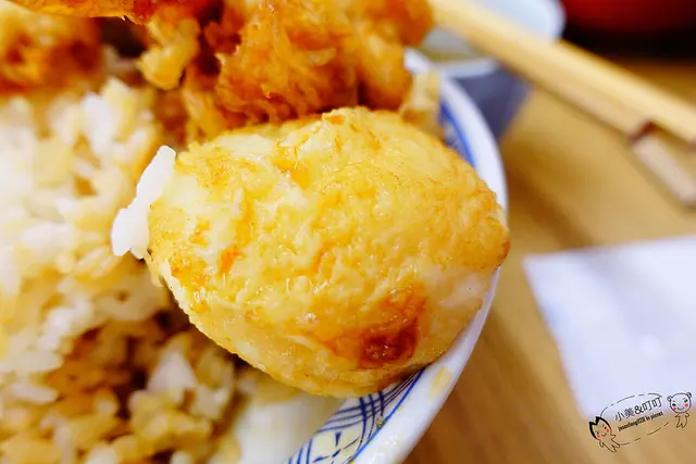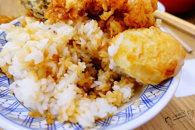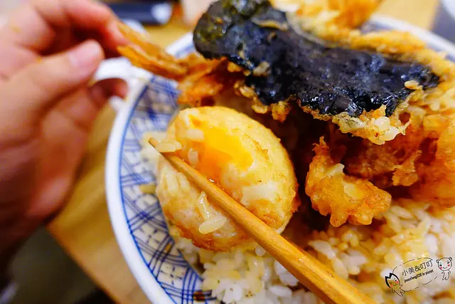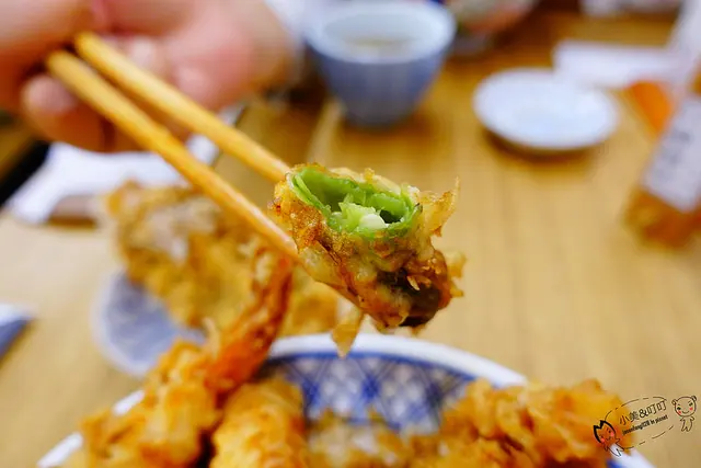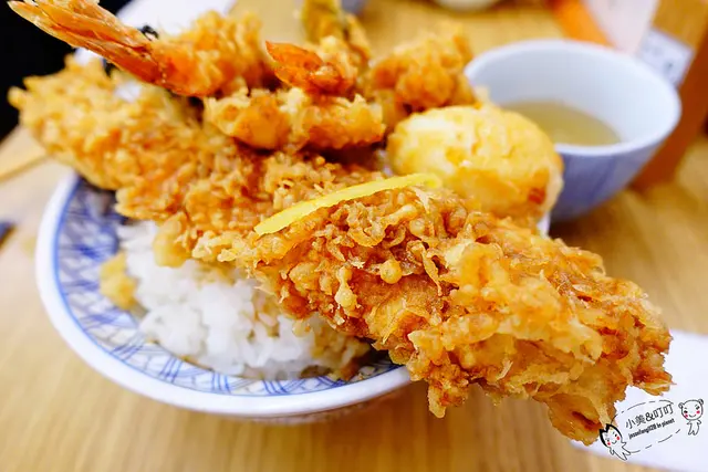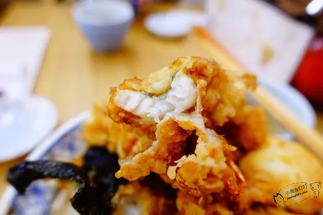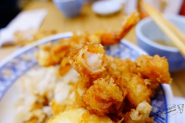 我們被了這滿滿的天丼給驚訝住了,真的很澎拜!有穴子、半熟蛋、炸蝦、干貝海鮮魷魚炸、海苔片與青龍