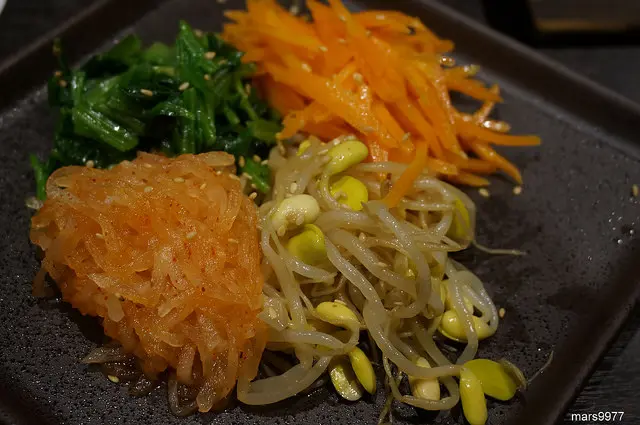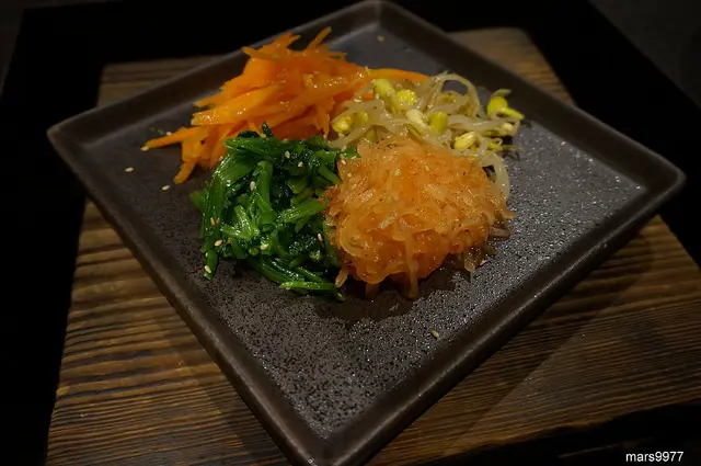 透過新鮮蔬菜下去調味醃製出來的涼拌黃豆芽、菠菜、紅蘿蔔、菜頭絲