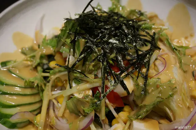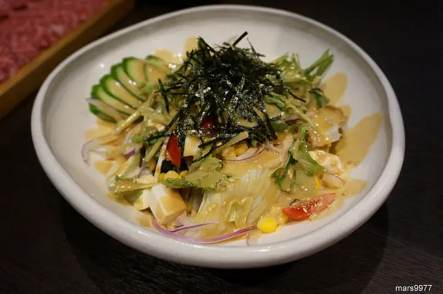 配上玉米、蕃茄以及青綠的水菜再淋上濃郁的胡麻醬