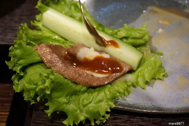 將肉品搭配生菜組合包含生菜、小黃瓜、蒜片以及特制醬料等