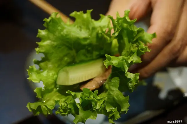 讓生菜的包覆小黃瓜的清脆以及蒜片醬料的提點