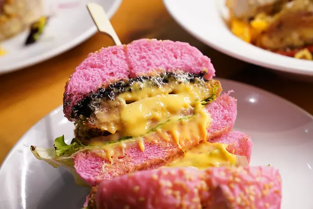 可千萬別被這顏色給嚇著了,粉色的關係更是因為它是覆盆莓來製成的,麵包的食感既扎實又柔軟,夾著厚重的起司豬排,拿在手上那份量可是一點也無法忽視。