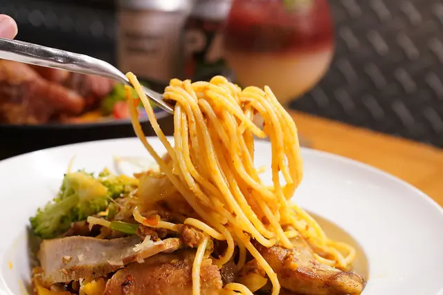 採用本土岡山辣醬與茄汁肉醬彼此拌炒,誰說義大利麵只能永遠的肉醬、青醬與奶油白醬,沒想到岡山辣醬拌炒起來好涮嘴,飄香一甲子的辣豆瓣,滋味十分有趣,酸甜又微辣的質地,襯著柔軟又有彈性的麵條,好過癮!最後不忘來一口松阪豬,好過份的美。