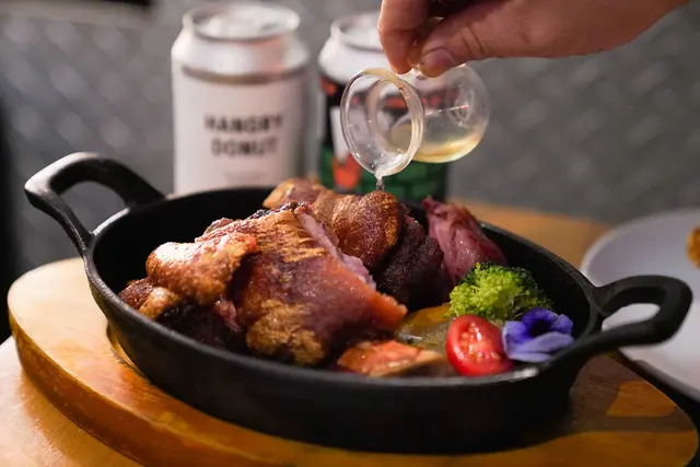 咬起來卡滋卡滋的聲響,滿是膠質的滋味,佈滿了雙唇,迷人的酒香,伴隨著脆口的豬皮、豬肉洋溢的在嘴中跳舞,即使吃多了仍感受不出油膩感。