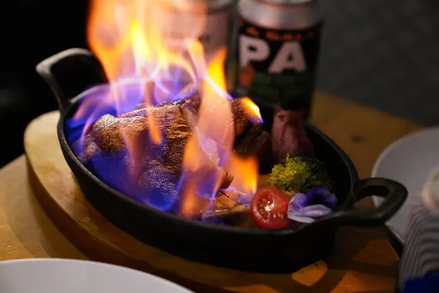 熊熊熱火燃燒著酥脆的豬腳,酒香瀰漫著空氣中,有如一場秀,就這樣即興的展開,捕捉的速度實在來不及,老闆說,要濃一點就給他燒久一點。