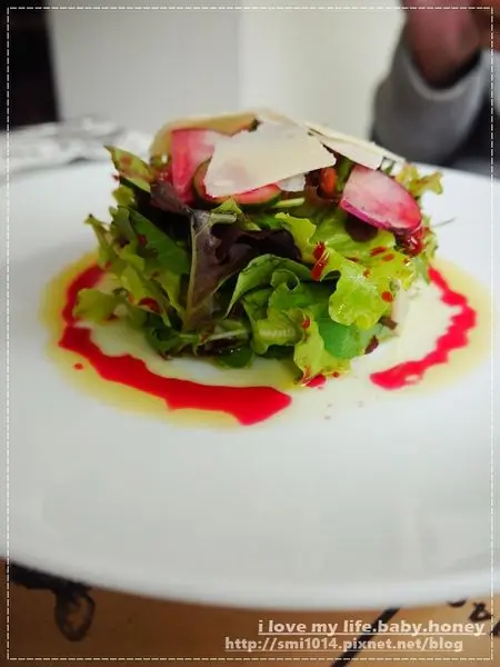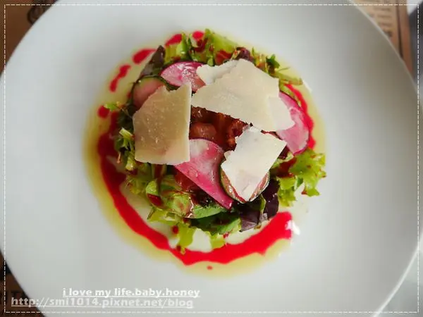 沙拉擺盤配色也是超級美的,除了生菜之外還擺上了甜菜根