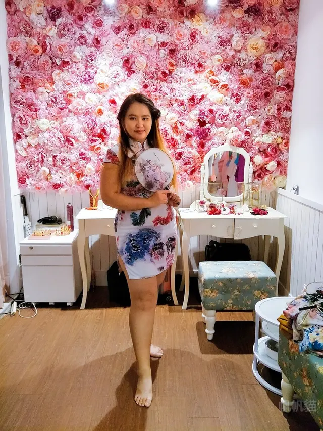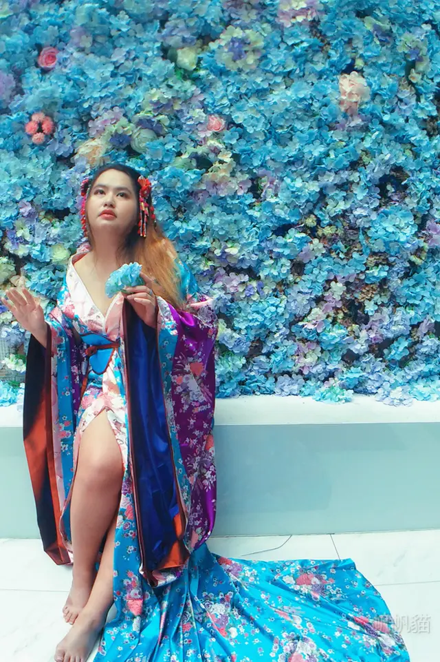第一套換了日本花魁裝,據說是店裡最人氣的服裝,可以請店員協助換裝,戴上頭飾,到一樓的花牆拍照,瞬間柔媚度破表,拿起旁邊的花傘轉圈拍影片,加上特效,朋友都說穿這套,笑起來有壞壞的感覺,很能勾人。