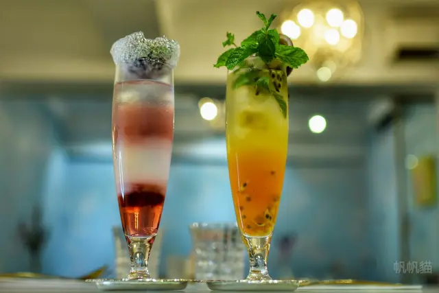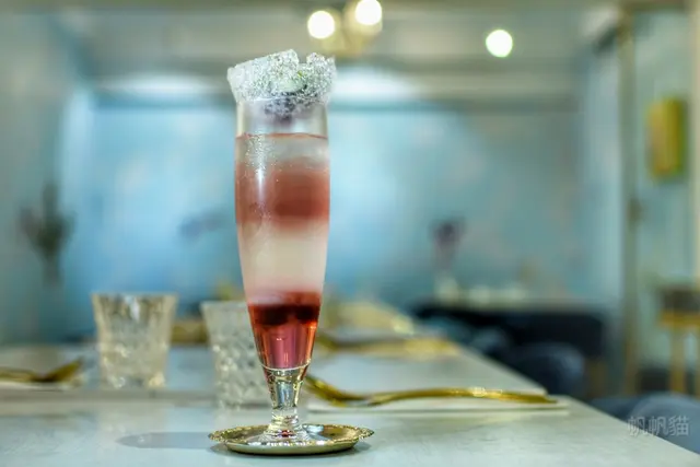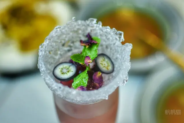 閨蜜裡面有莓果、藍莓、薄荷葉、玫瑰花瓣,上方盛裝的是冰球,把冰球戳破,攪拌均勻,就會出現美麗的漸層,喝起來會比較甜一些,象徵著閨蜜甜甜的友誼吧!