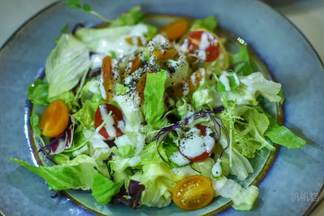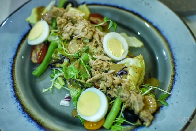 鮪魚沙拉,裡面有水煮蛋、蔬菜、四季豆, 淋的是類似芝麻醬,吃起來還滿香的。
