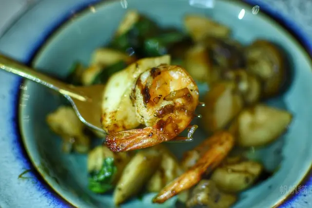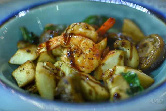 鮮蝦蘑菇,用的是綜合菇,主要有杏鮑菇、蘑菇,會炒九層塔加黑胡椒提味,菇菇的保水度很夠,所以口感不但脆而且又多汁。