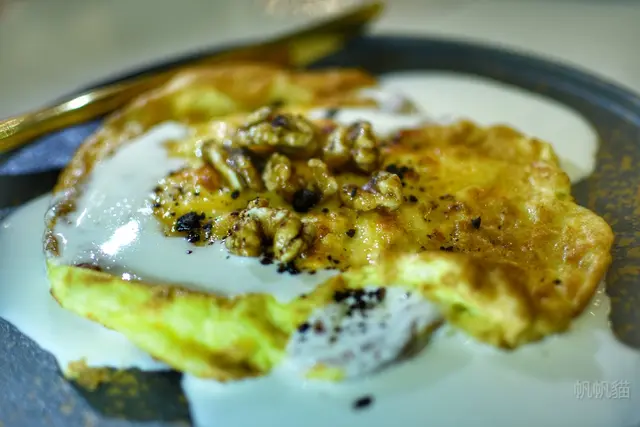 蜂蜜起司烘蛋,烘蛋上面淋了蜂蜜,底下是起司醬,並灑上核桃,起司的香氣濃郁,吃起來鹹鹹甜甜,又有點QQ的。
