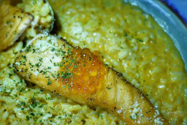 鮭魚燉飯,主要是用酸辣醬,以泰式料理的方式烹調,有點冬陰的感覺,屬於酸酸辣辣,不過辣的部分只是提味,個人覺得是完全不辣,上面有起司粉跟魚卵,整口的燉飯加上會"撥撥撥"流汁出來的魚卵,吃下去整個大滿足。