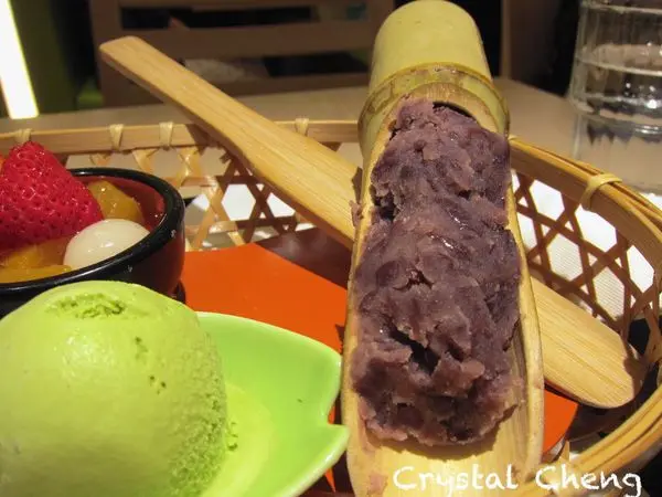 一旁的紅豆泥用竹筒盛著,要的時候再用竹片刮一點加入最中裡。