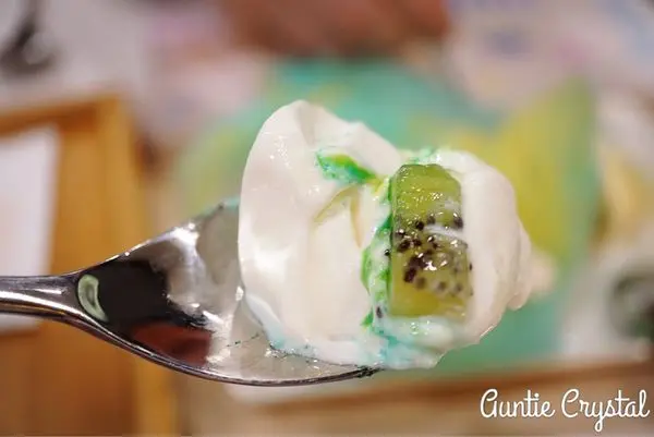 杯子裝著香濃牛奶冰淇淋,還加入玉米片增加口感,還有切丁的酸甜奇異果!