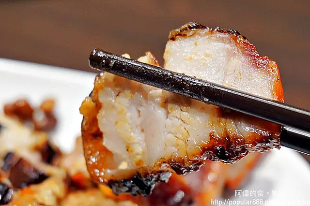 燒肉是選用肥瘦分明的部位,保留充滿膠質的豬皮及少許軟骨,以獨門醬料醃漬,高溫烤爐燒至表皮金黃酥脆。