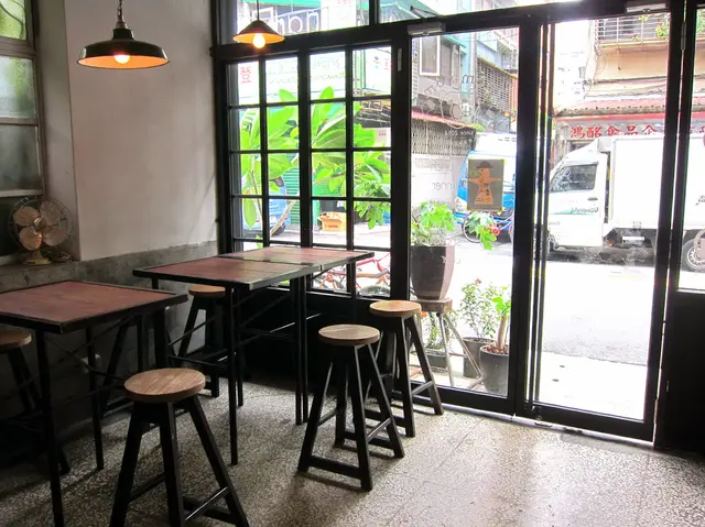 店內座位以不同風格的木頭桌椅為主,進門後的右邊是高腳木椅