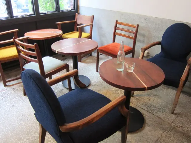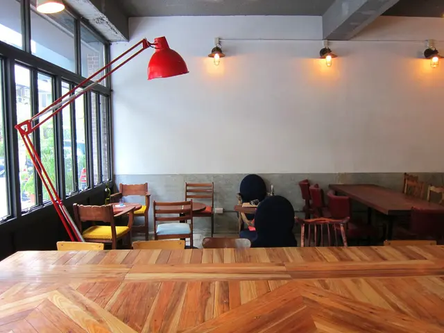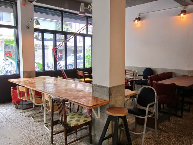 左邊則是一整片的木桌與幾種不同風格的木椅