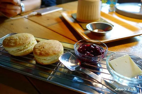 現烤出爐的司康一份兩個,另附上莓果果醬及奶油,以日本昭和蛋糕粉、法國isigny發酵奶油和小麥胚芽製作,一端到我們面前便是香氣撲鼻讓人十指大動,但吃進嘴裡卻又不像一開始聞到的香味濃烈,而是轉為淡淡的麵粉香,這裡的司康烤的酥脆大過於蓬鬆,但吃起來不會過乾,搭上果醬和奶油都挺耐吃。
