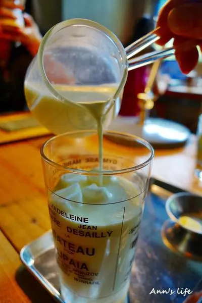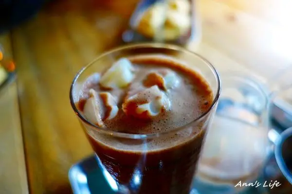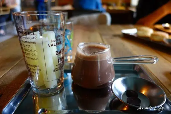 而我點的黑巧克力飲也有多種%數選擇,不想嘗的太苦也不想甜到翻天,權衡之下選了比較介於中間值的72%,無論是黑巧克力或是白巧克力皆搭配牛奶冰柱,原本我們還天真地以為黑巧克力飲的冰柱會是黑巧克力製成,白巧克力飲則是白巧克力製成,事後證明其實都是一樣的XD只是,這牛奶冰柱還是挺特別,比起一般冰塊溶化後會稀釋飲料的味道,這樣的方式既有特色,又能保持巧克力飲原有的濃醇,我個人還是很激賞,當然也很好喝。