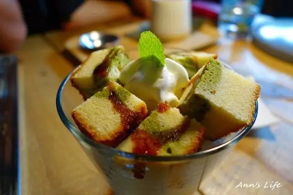 甜點的部分老實說我覺得選擇上少了一點,且當天並無供應布丁,可以挑選的只剩磅蛋糕、司康和生巧克力,我們正好各點了一款一起分食,磅蛋糕聖代杯有水果、香草、可可、抹茶四種口味,這天雀屏中選的是抹茶,我還蠻喜歡這裡的磅蛋糕,冰涼紮實不乾澀,奶油也很細緻,是一道吃了會開心的甜點。