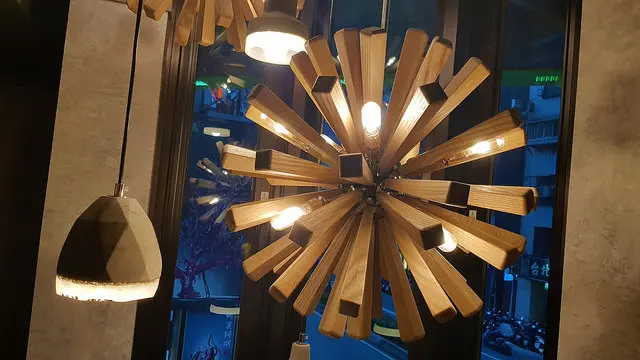無論是特色的木頭吊燈以及牆面懸掛的木片佈置搭配上
