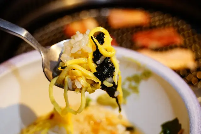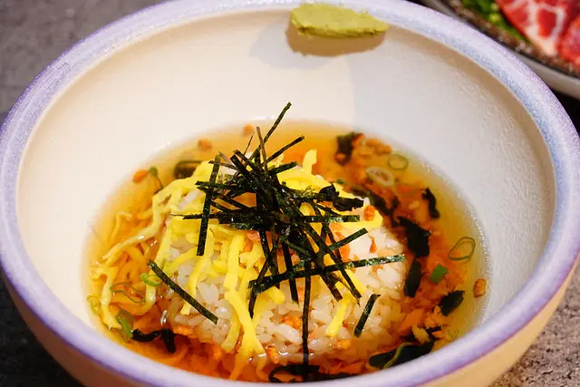 一匙可以撈到茶水的湯汁鮭魚蛋絲和米飯