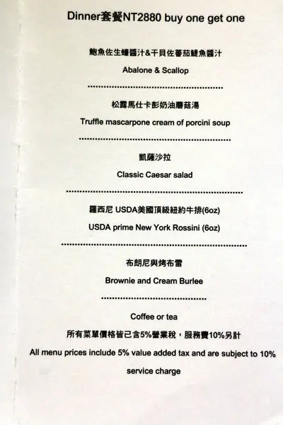 推出頂級羅西尼美國紐約牛排買一送一的活動,雙人份只要 NT$$2880+20%,
