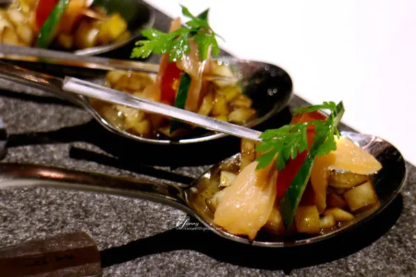 這道前菜非常地清爽,一口吃掉黃瓜蕃茄及鮭魚的組合,煙燻味道在口中散發。